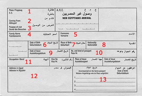 Bei der Einreise nach Ägypten müssen Sie dieses Formular ausfüllen und bei der Passkontolle vorlegen. Sie erhalten diese Karte in der Regel im Flugzeug. Um Missverständnissen vorzuzbeugen, hier eine kleine Hilfe: